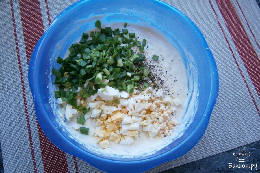4. Снова все размешать, замешивая тесто, как для обычных оладий. Сюда добавить зеленые перья лука, предварительно измельчи его и рубленые отварные яйца. Также всыпать черный перец.