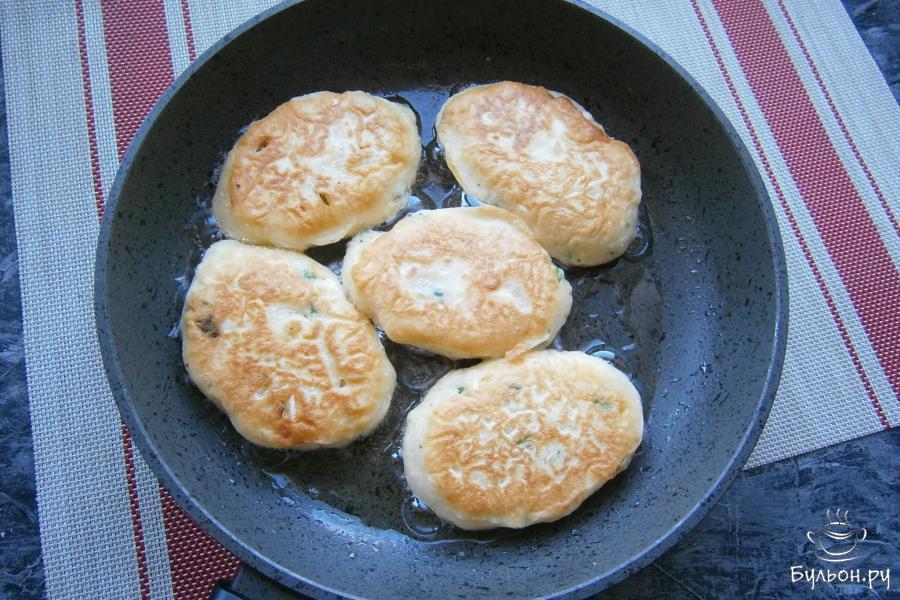 6. Хорошо разогреть любое растительное масло в сковородке, выкладывать в масло тесто в виде продолговатых пирожков-оладушек.