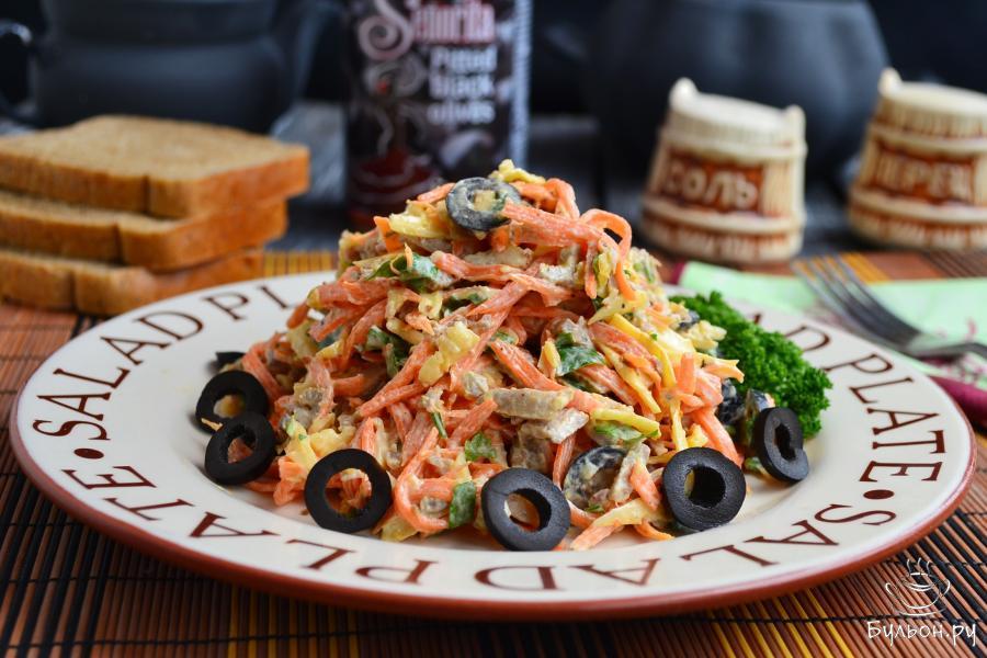 Салат с мясом с добавлением корейской моркови - отличный салатик, необычайно вкусный и довольно сытный. Такой салат можно предложить для своих родных к ужину, понравится он и гостям. У меня в рецепте используется свинина, можно взять любое мясо, куриную или индюшиную грудку. По желанию, в салат можно добавить немного свежего огурца. Оливки можно заменить маринованным огурчиком. Подавайте салат с мясом на красивой тарелке, посыпанный свежей зеленью для декора. Этот салат не только вкусен, но и представляет собой яркое блюдо с разнообразием текстур и вкусов, что обязательно порадует ваши вкусовые рецепторы и глаза гостей.