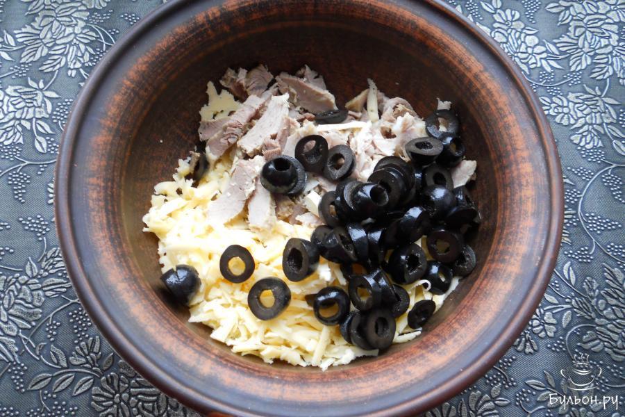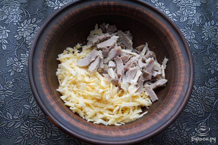 1. Мясо предварительно отварить до готовности в подсоленной воде и остудить. Порезать мясо соломкой, сыр твердый натереть на крупной терке.