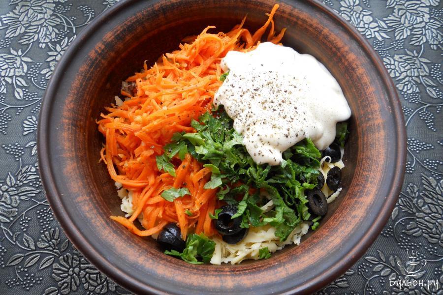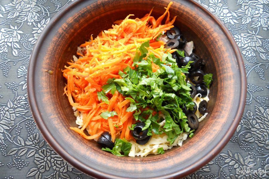 3. Зелень петрушки измельчить. Морковь по-корейски порубить ножом. Добавить морковь и измельченную петрушку к остальным продуктам.