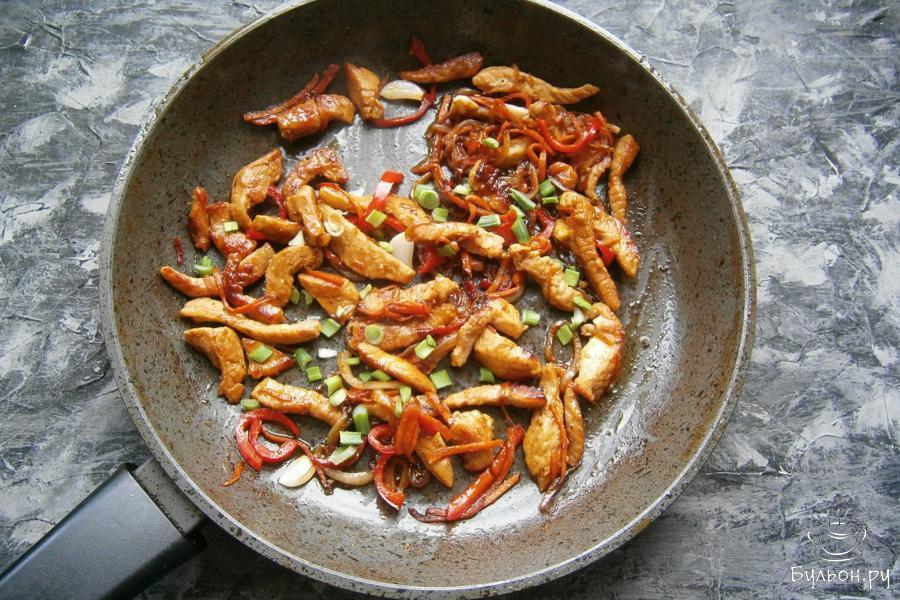 5. Подержать мясо на огне еще буквально 3-4 минуты, посыпать измельченным зеленым луком и выключить газ. Оставить мясо под крышкой на 5 минут.