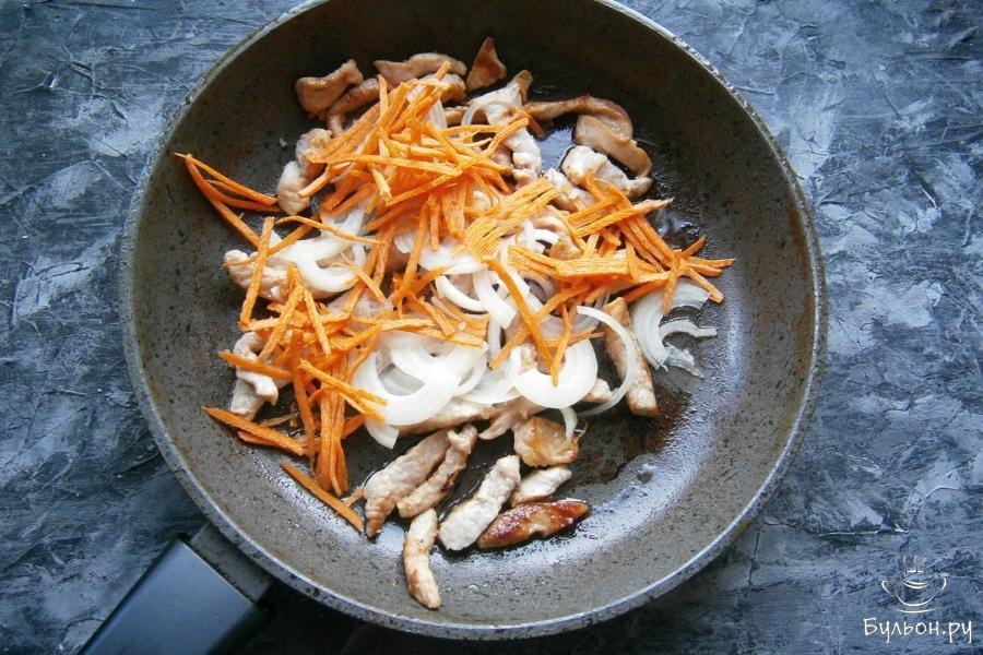 2. Обжарить мясо в течение 5 минут (до румяного цвета) на растительном масле, на достаточно сильном огне, периодически перемешивая. Добавить в сковороду порезанный тонкими полукольцами лук и порезанную тонкой соломкой или натертую на корейской терке морковку.