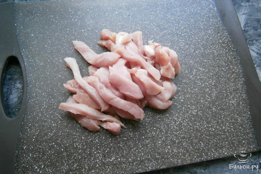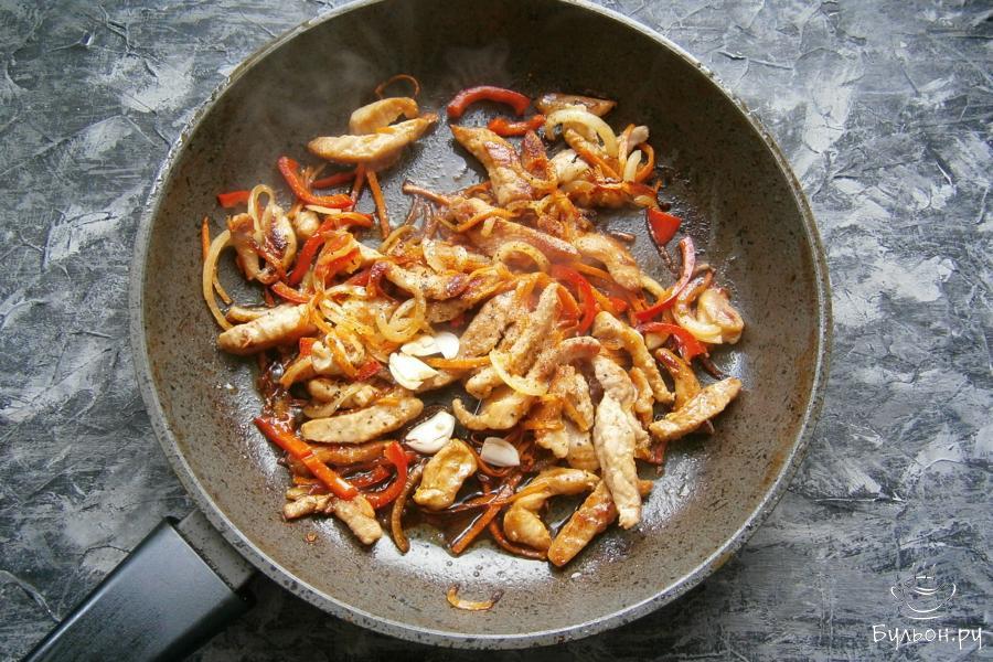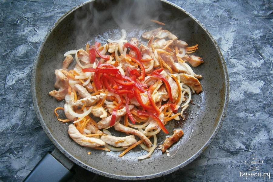 3. Сюда же, добавить и порезанный соломкой болгарский перец. Жарить все вместе еще 5 минут на среднем огне.
