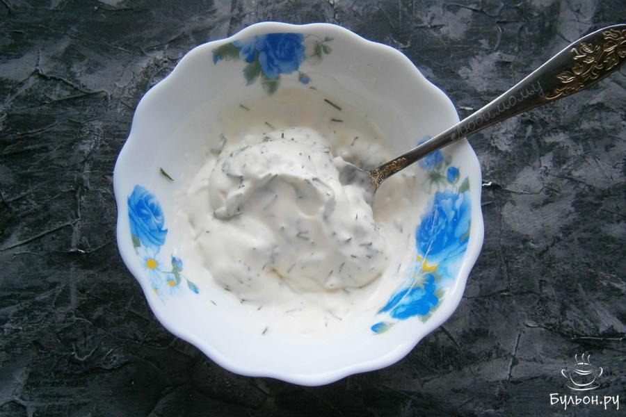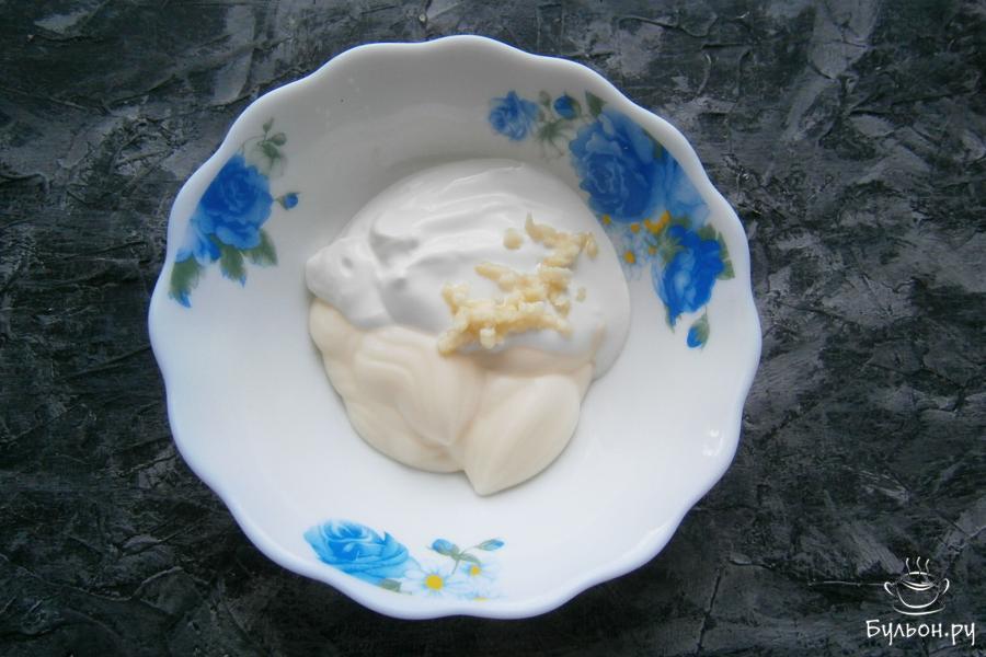 1. Прежде всего нужно приготовить соус для шаурмы: к майонезу добавить сметану и измельченный чеснок.