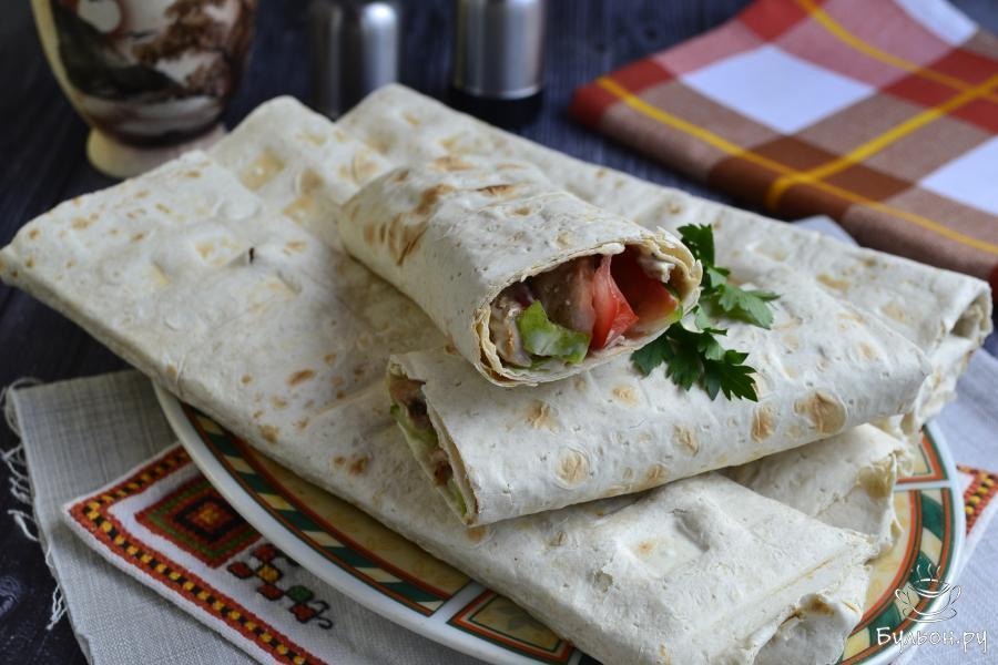 8. Теперь шаурму можно подогреть и поджарить на гриле, в духовке или сковороде. Подавать шаурму теплой и сразу же. Приятного аппетита.
