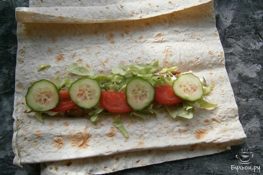 5. Сверху выложить часть порезанной молодой белокочанной капусты или можно взять - пекинскую, а также, листья салата. Далее, разложить дольки свежего помидора и кружочки свежего огурца.