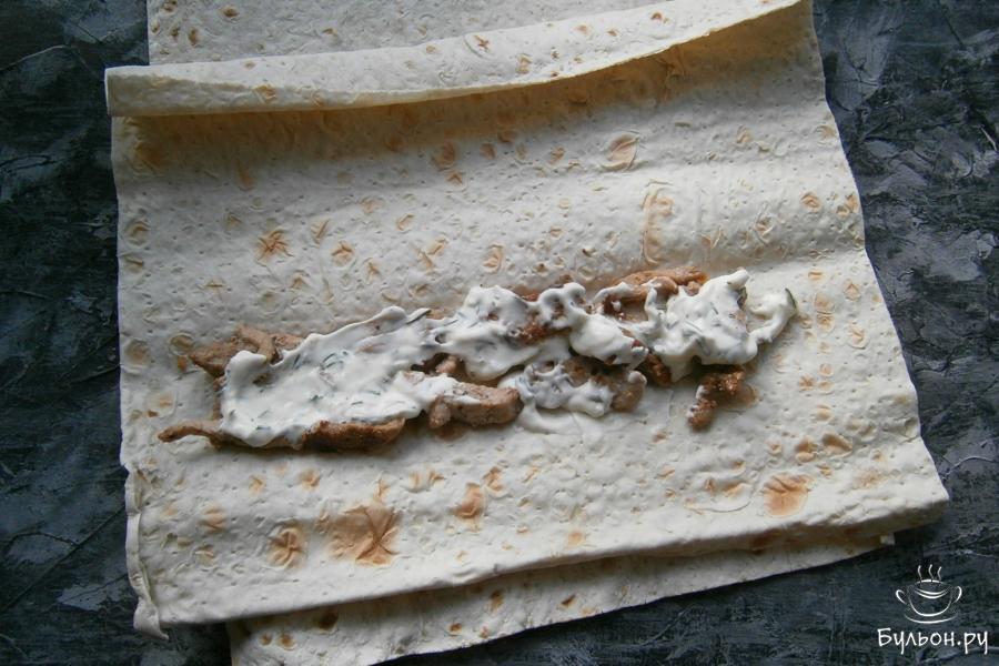 4. У меня лаваш большой, я взяла 2 штуки и разрезала их на 4 шт. Мясо разделить на 4 части и одну - выложить на лаваш, смазать его обильно соусом.