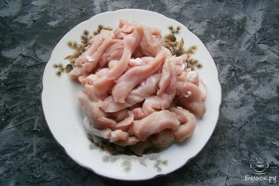 3. Мясо порезать длинными брусочками и обжарить его на сильном огне, на растительном масле, немного посолив и посыпав черным перцем. Жарить нужно минут 5-7 - до румяного цвета. Мясо остудить, убрав бумажным полотенцем лишний жир.