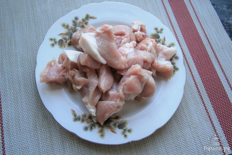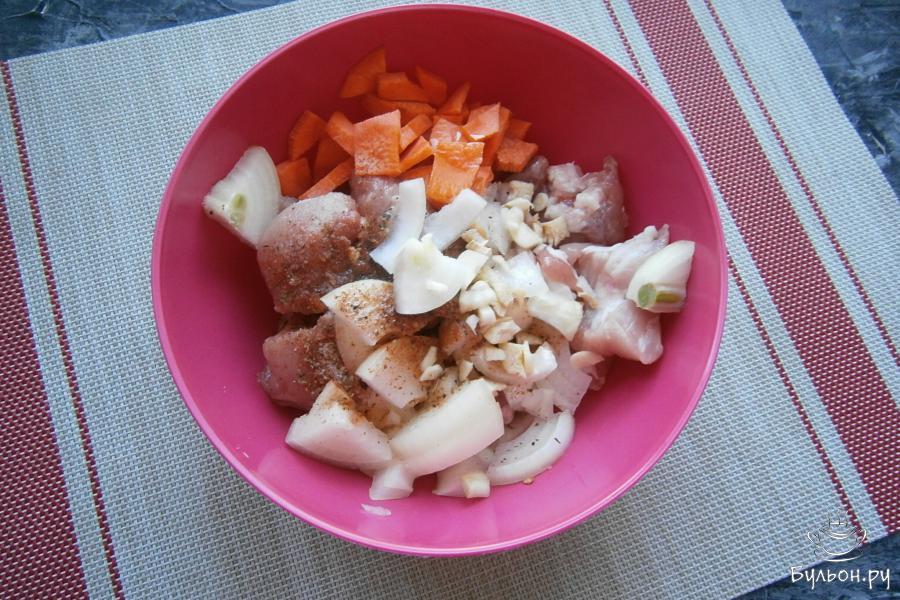 2. Добавить к мясу достаточно крупно порезанные лук с морковкой и порезанный кусочками чеснок. Всыпать соль и мясную приправу, влить ложку растительного масла. Все вместе перемешать.