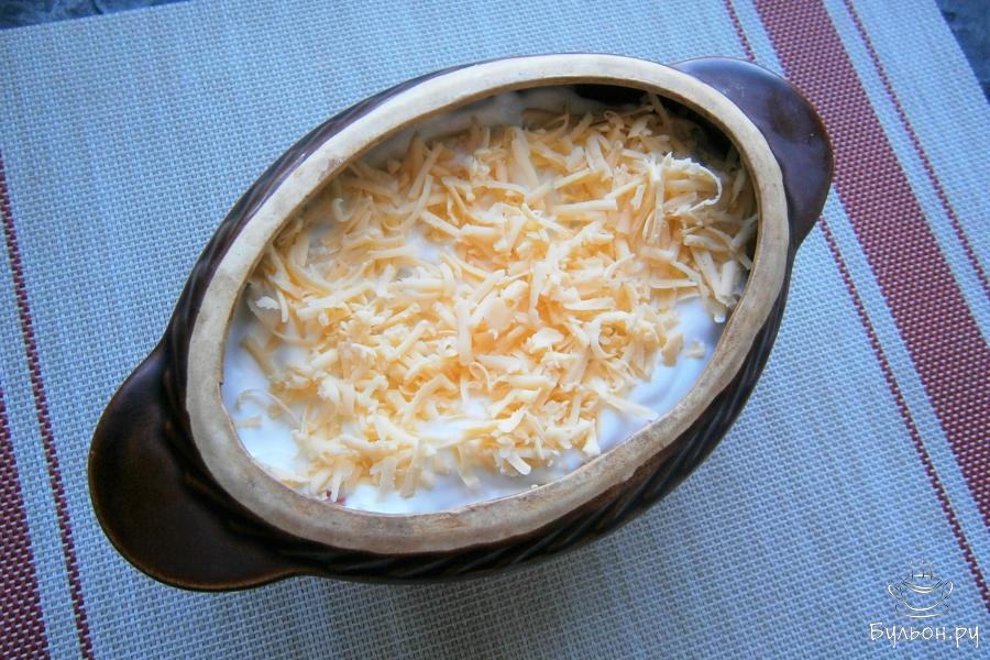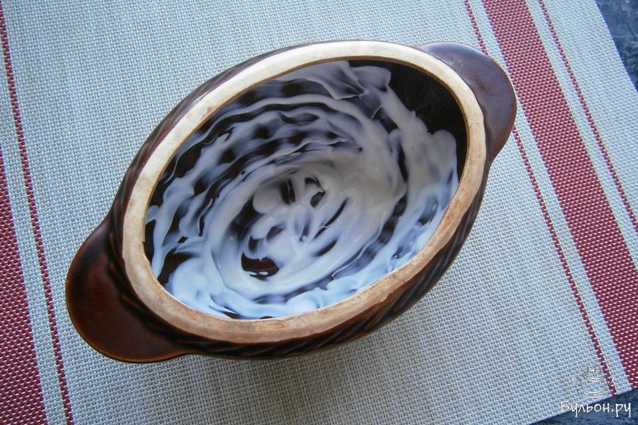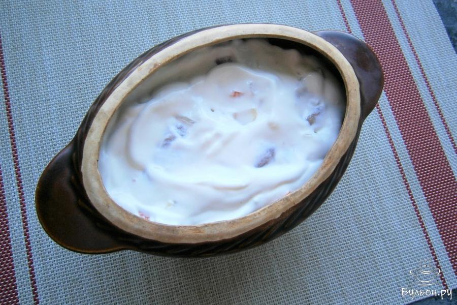 4. Выложить в него мясо с овощами и сверху смазать обильно оставшейся сметаной. Никакой жидкости больше добавлять не нужно.