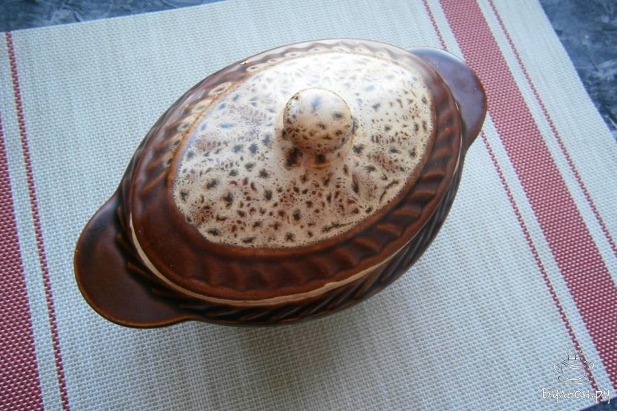 6. Горшочек накрыть крышечкой и отправить в разогретую духовку. Готовить свинину при температуре 200 град. с закрытой крышкой около 1 часа.