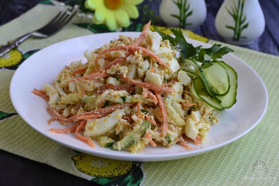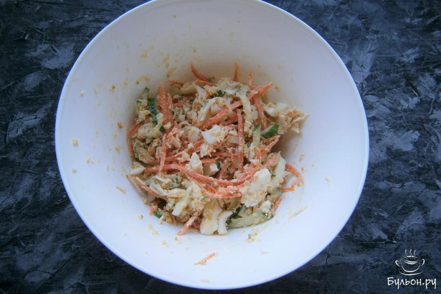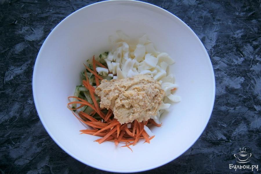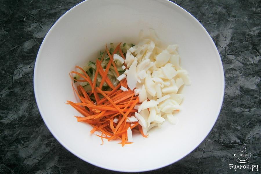 2. Яйца заранее отварить, очистить от скорлупы и разделить на желтки и белки. Белки порезать длинными кусочками. Морковку натереть на корейской или крупной терке. Белки и морковь добавить к остальным ингредиентам.