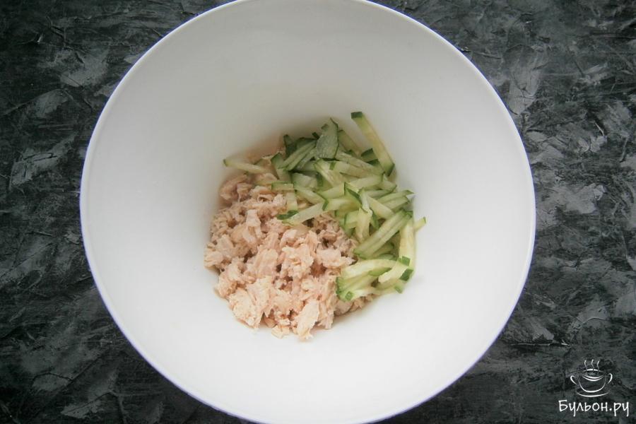 1. Предварительно сваренное и остуженное куриное филе порезать небольшими кусочками, добавить порезанный соломкой зеленый свежий огурчик.