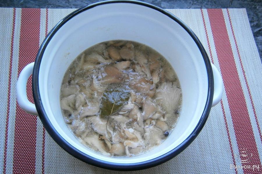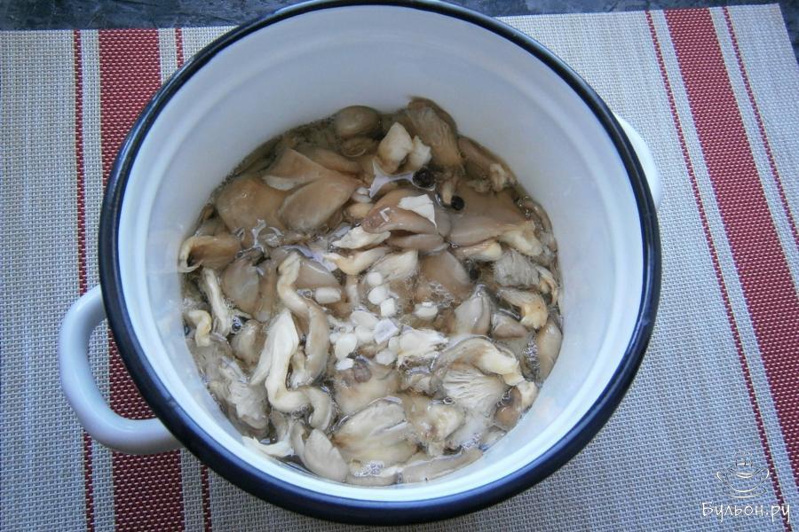 3. Выложить в кастрюлю с маринадом грибы, добавить 2 порезанных зубчиков чеснока, варить все на небольшом огне около 15 минут. Далее, влить обычный столовый уксус и кипятить вешенки еще несколько минут.