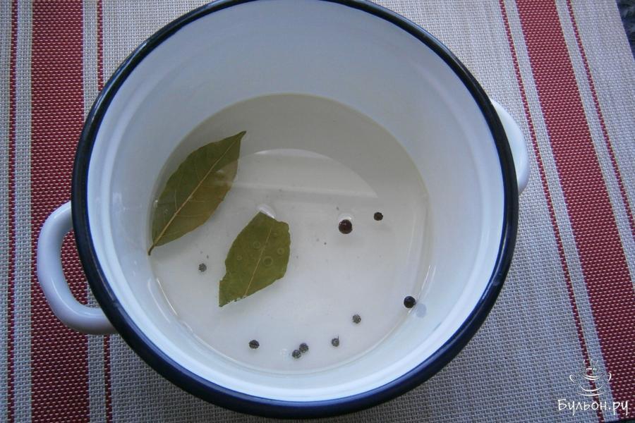 2. Для приготовления маринада: в кастрюльку налить холодную воду, всыпать 1 ч. л. соли и 2 ч. л. сахара, добавить пару лавровых листиков, перец-горошек (душистый и черный), влить рафинированное растительное масло. Довести маринад до кипения.