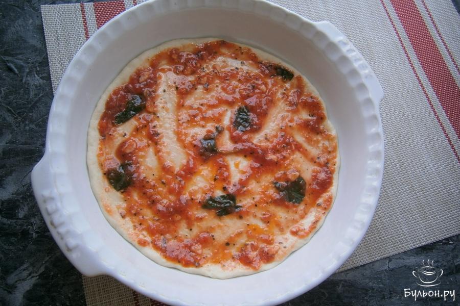 12. Тесто раскатать в тонкий круг, разместить его в специальной форме для выпечки пиццы или другой подходящей форме, формируя совсем небольшие бортики. Смазать тесто соусом.