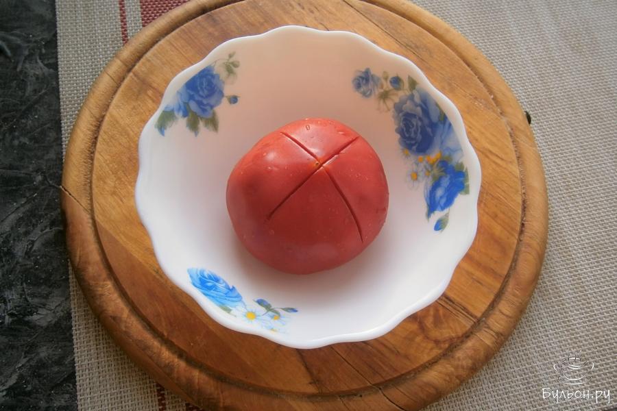 1. Из данного количества продуктов можно испечь 2 пиццы диаметром около 26-28 см, в этом случае делите все пополам. Прежде всего нужно приготовить соус для пиццы. Для этого: один свежий, крупный помидор надрезать сверху крестообразно, поместить в мисочку.