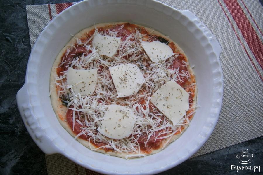 14. Часть моцареллы натереть на терке, часть - порезать тонкими ломтями. На соус выложить оставшийся помидор, порезанный тонкими кружками. Посыпать все тертым сыром и выложить по кругу ломти сыра. Посыпать все орегано и немного черным перцем. Разогреть духовку до 220 град.