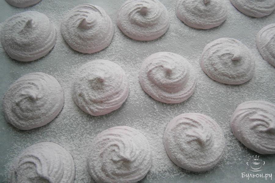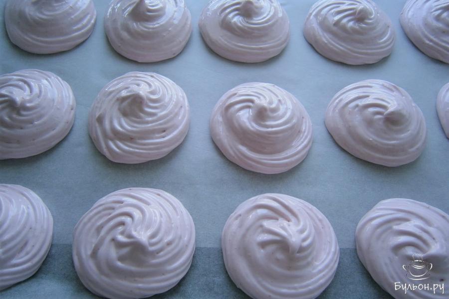 13. Отсадить зефир на противень, застеленный пергаментом. Если у вас нет кондитерского мешка, массу можно разложить по силиконовым формочкам для маффинов, печений и т. д. или выкладывать зефир ложкой.