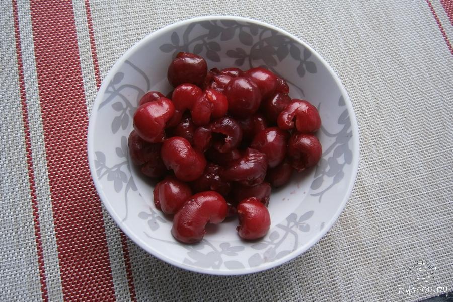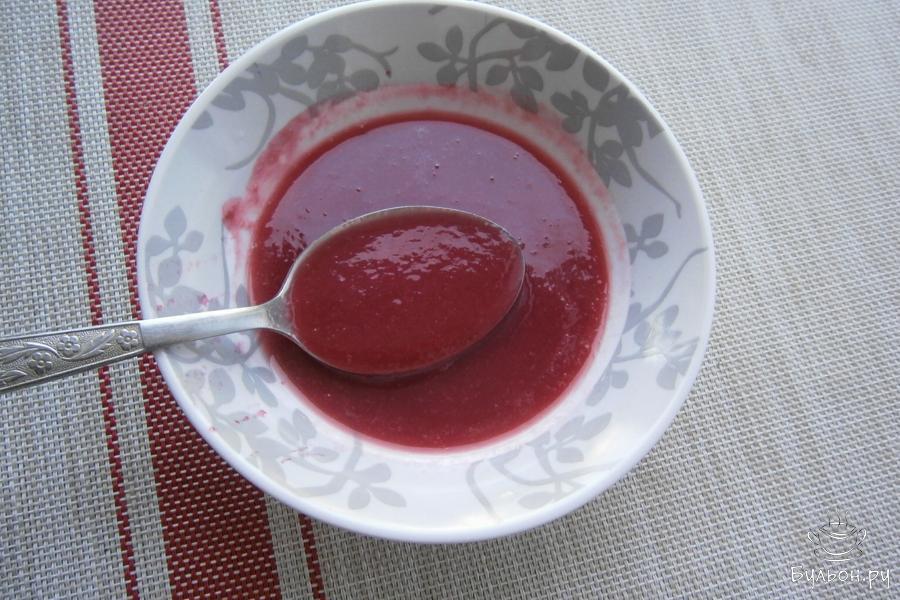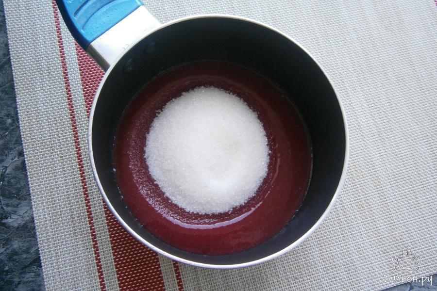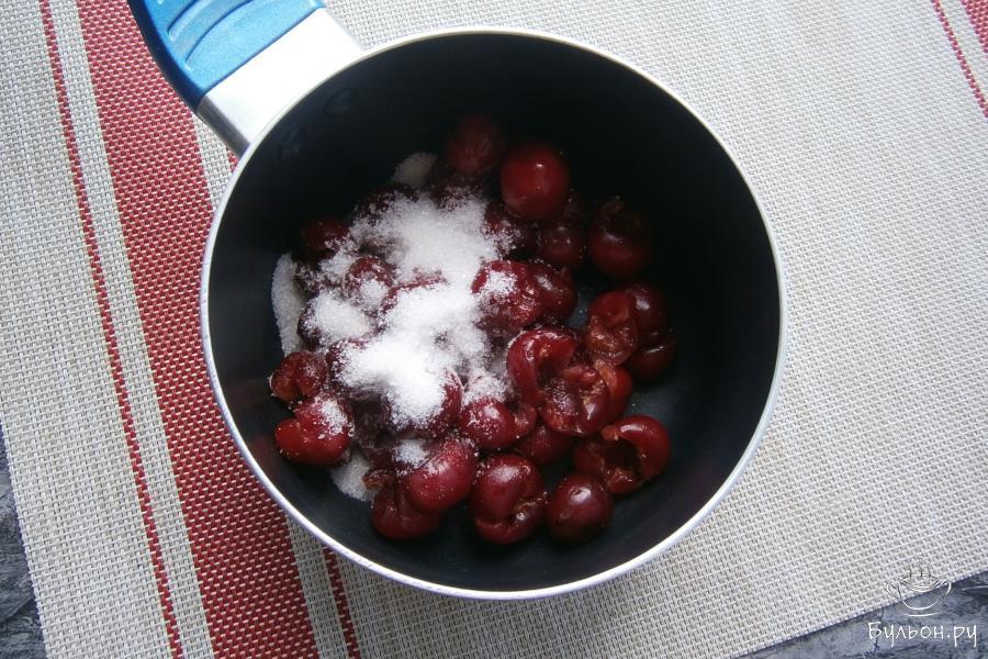 6. Вишневое пюре (его должно быть 125 г) соединить с 125 г сахара, довести до кипения, кипятить около 2 мин, после чего полностью остудить.