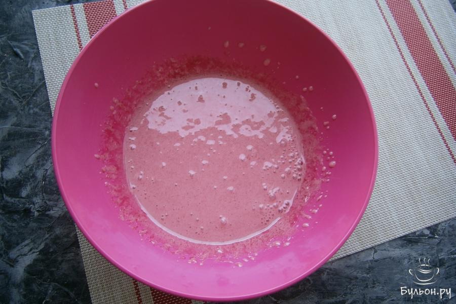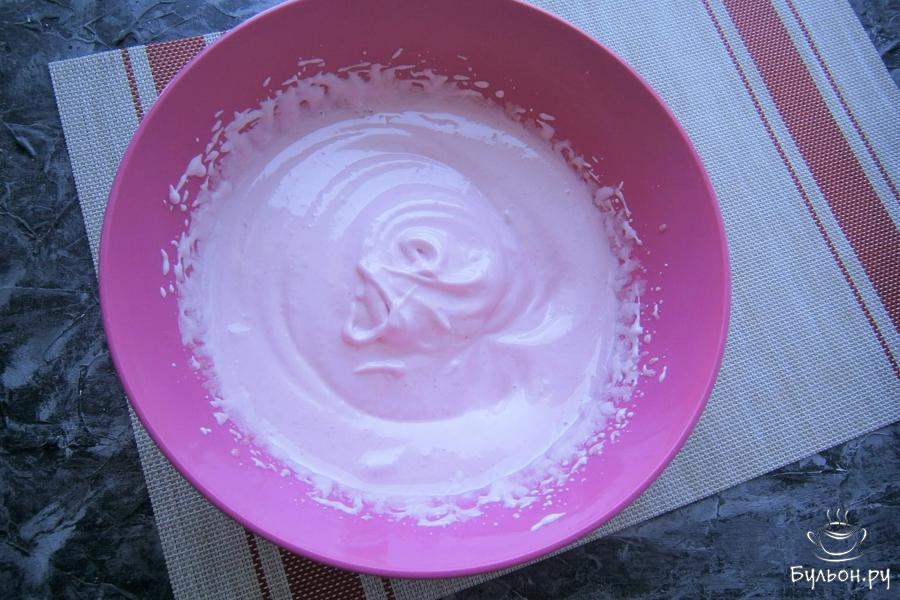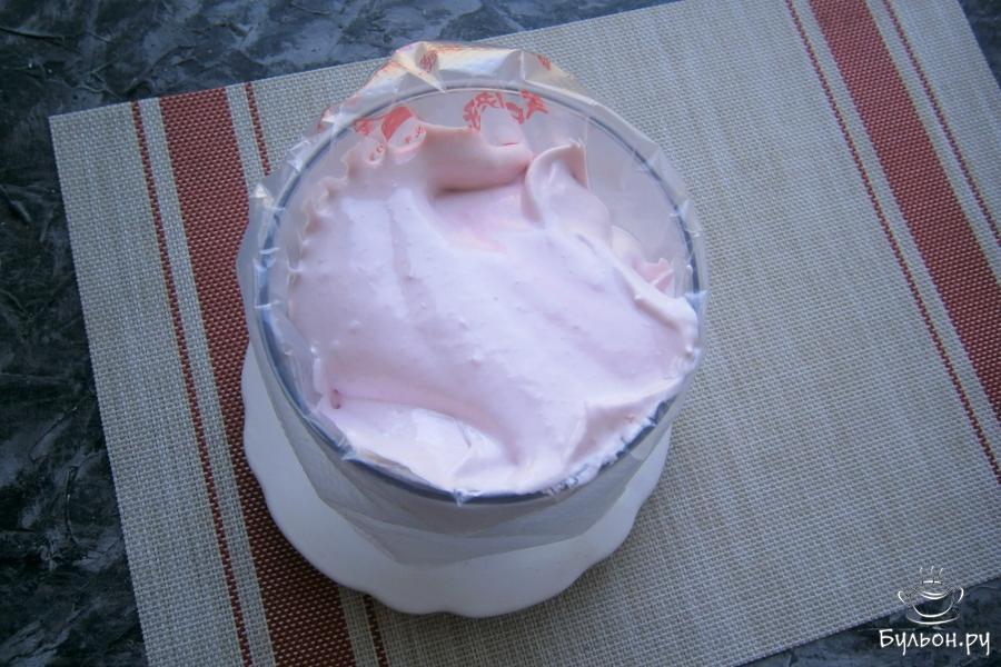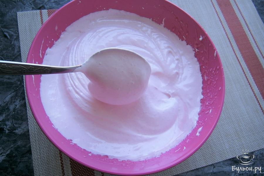 11. Снять сироп с огня, дать ему остыть в течение 30 сек. и сразу же, вливать тонкой струйкой в вишнево-белковую массу, взбивая ее миксером на высокой скорости. Масса должна получиться пышной, устойчивой и довольно густой.