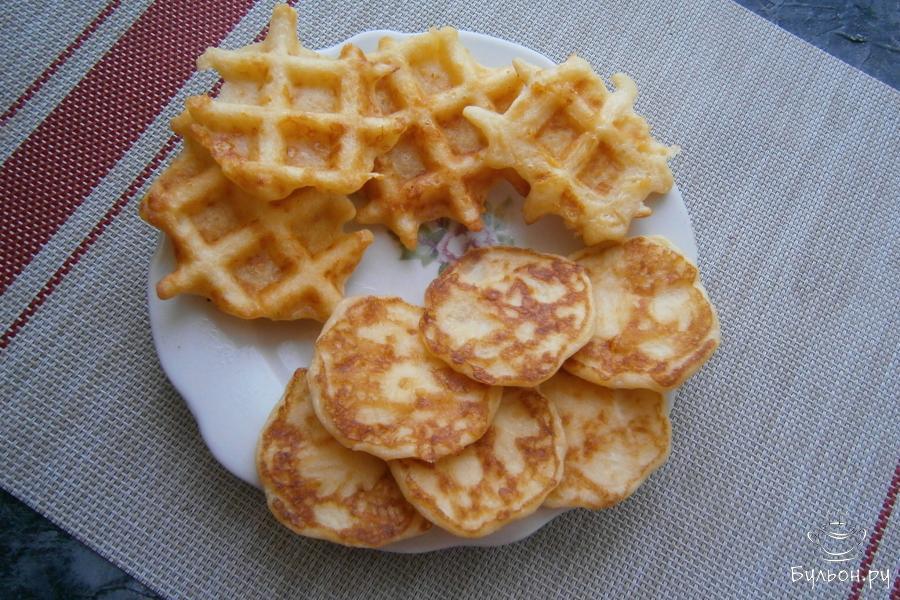 6. Теперь нужно испечь небольшие оладушки или в электровафельнице около 3-4 минут, или просто на сухой сковороде, выкладывая тесто чайной ложкой. Жарить их на сковородке до румяного цвета с двух сторон. Оладьи остудить, они станут плотными и немного хрустящими.