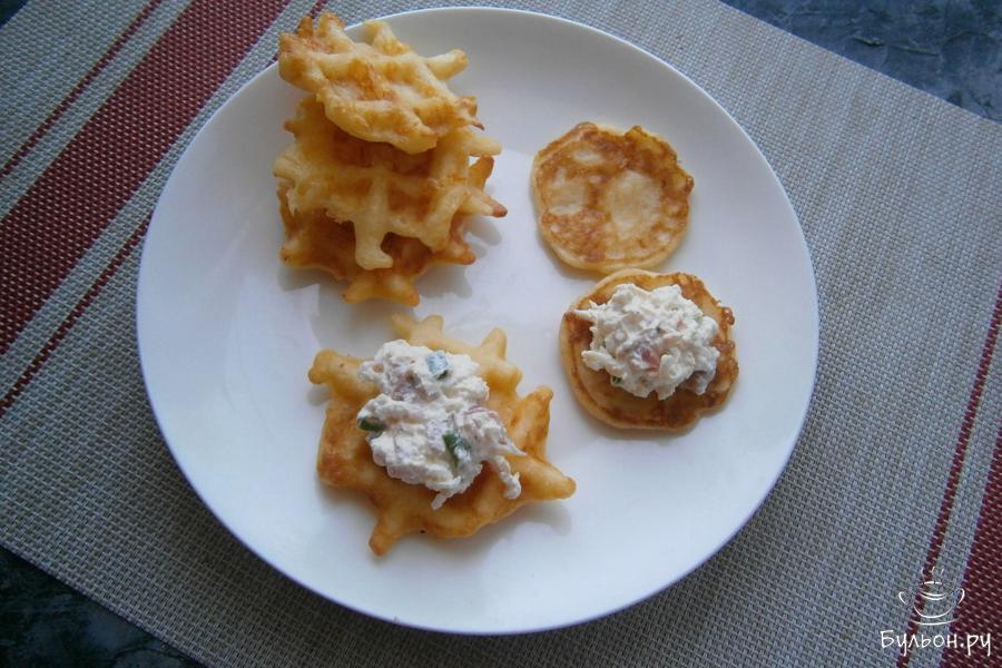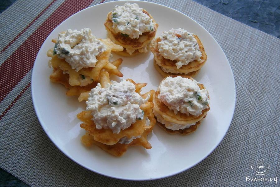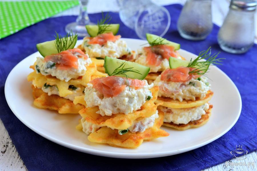 Эта интересная и красивая закуска украсит любой, даже самый изысканный праздничный стол. Готовится она совершенно не сложно и получается очень вкусной. Я использовала кусочки филе слабосоленой семги, вы можете взять любую красную рыбку. Если у вас есть вафельница, основу-оладьи можно испечь в ней, если же нет - оладьи просто можно пожарить на сковороде. Я предлагаю в рецепте оба варианта их приготовления. Готовые оладьи после остывания становятся немного хрустящими снаружи и на них отлично держится начинка с рыбкой. Рекомендую попробовать эту замечательную закуску, она точно вам понравится.