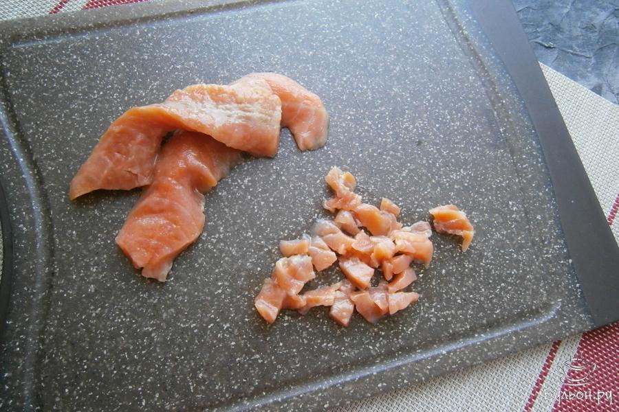 7. Для начинки: филе слабосоленой или соленой красной рыбы без костей порезать маленькими кусочками. Немного рыбы оставить для украшения.