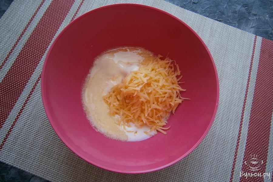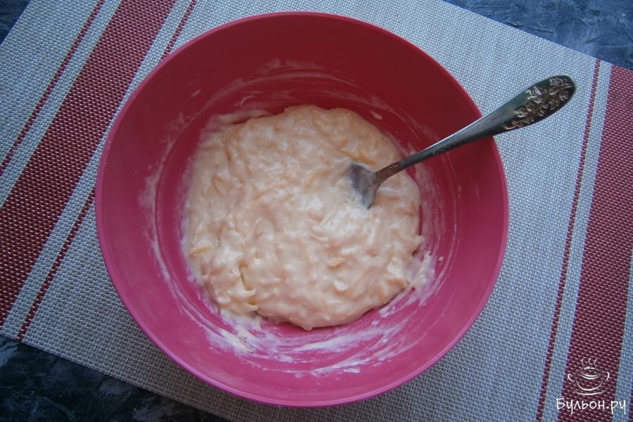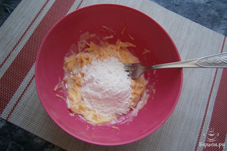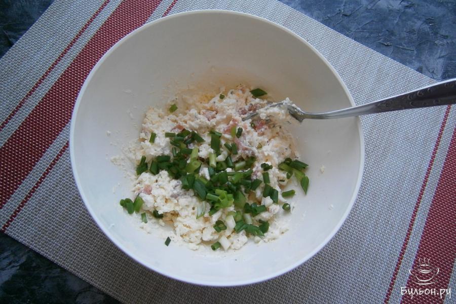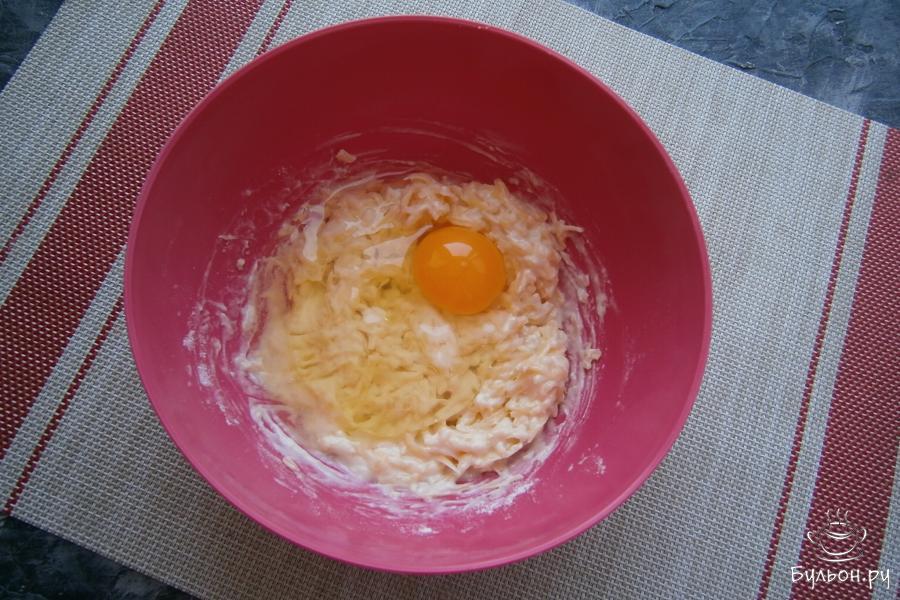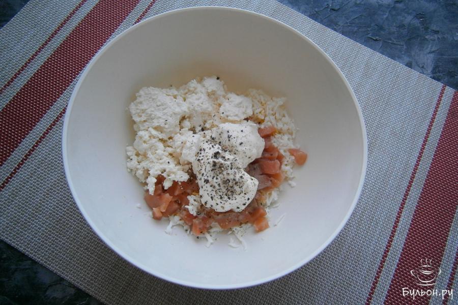 8. В миску натереть предварительно сваренное вкрутую и остуженное яйцо, добавить рыбу и мягкий творог.