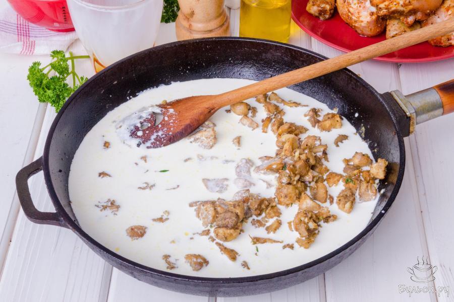 12. Добавляем к грибам сливки и постоянно помешивая, доводим до кипения. В самом конце приправляем соус солью и молотым перцем по вкусу.