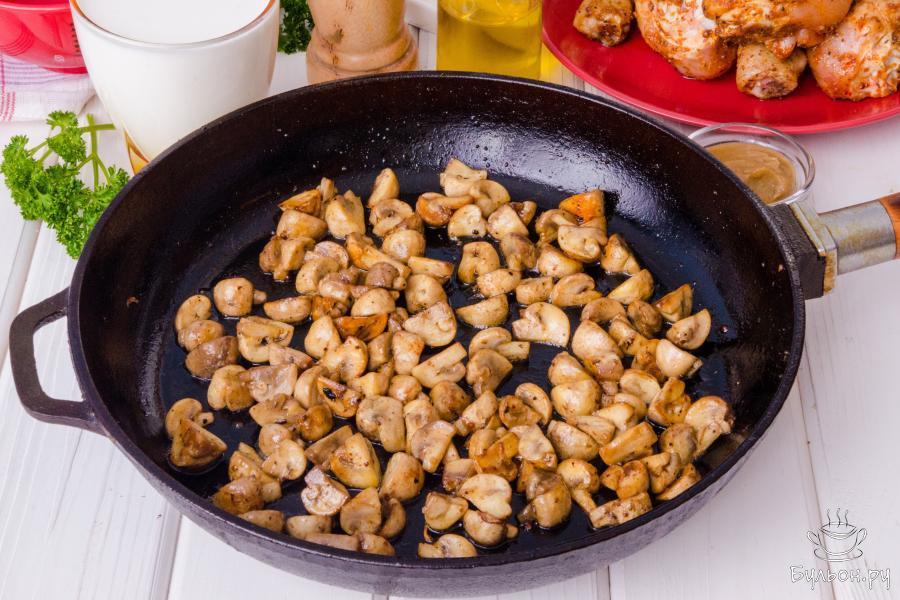 9. А на сковороду выкладываем нарезанные шампиньоны и не уменьшая нагрев обжариваем их в течение нескольких минут до легкого румянца.