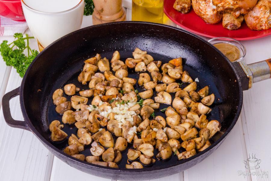10. Добавляем к грибам нарезанный чеснок и, по желанию, листики свежего тимьяна. Вместо свежего тимьяна можно использовать любые любимые травы по вкусу. Прогреваем грибы с чесноком и тимьяном 30-40 секунд.