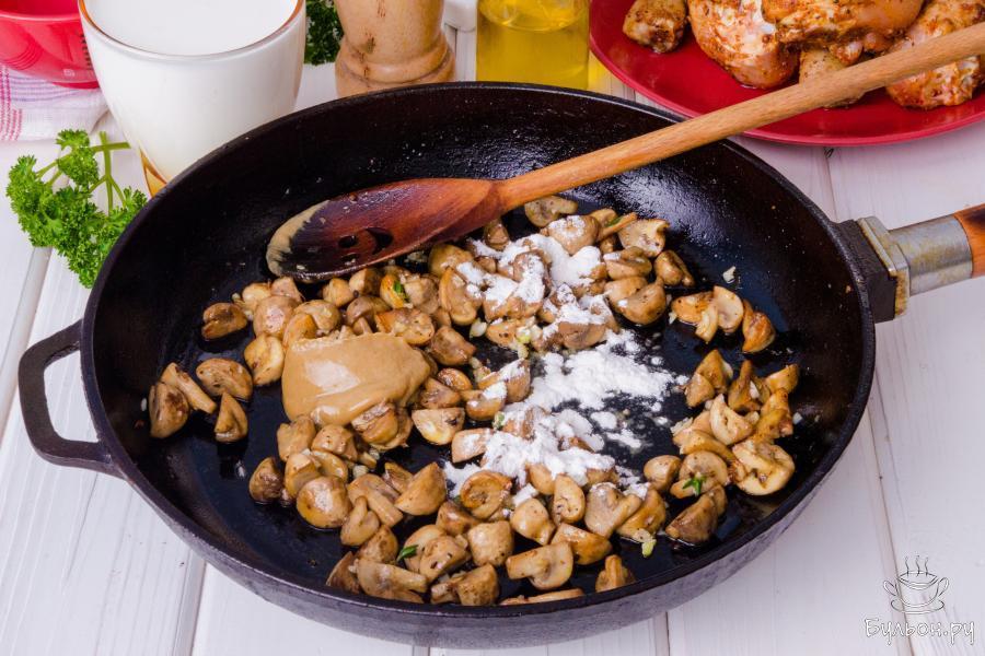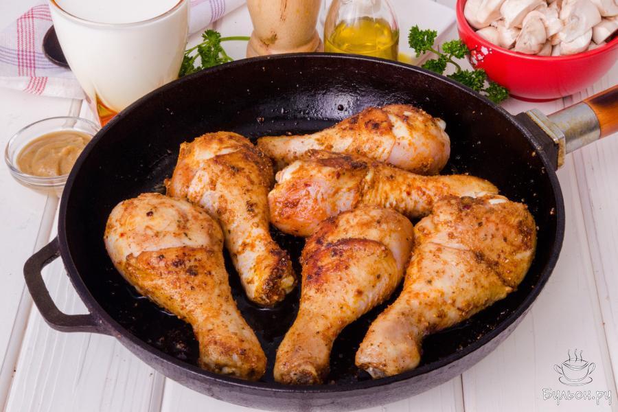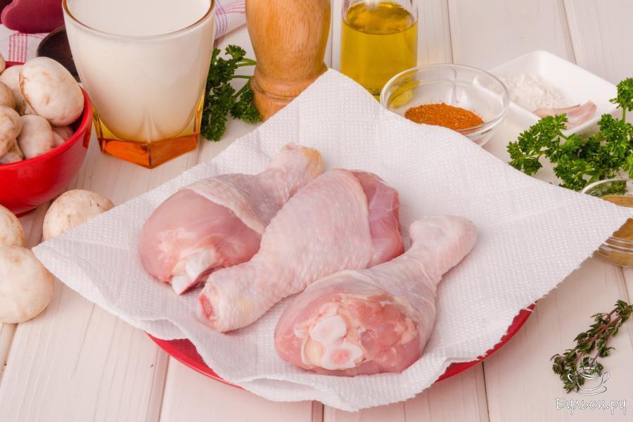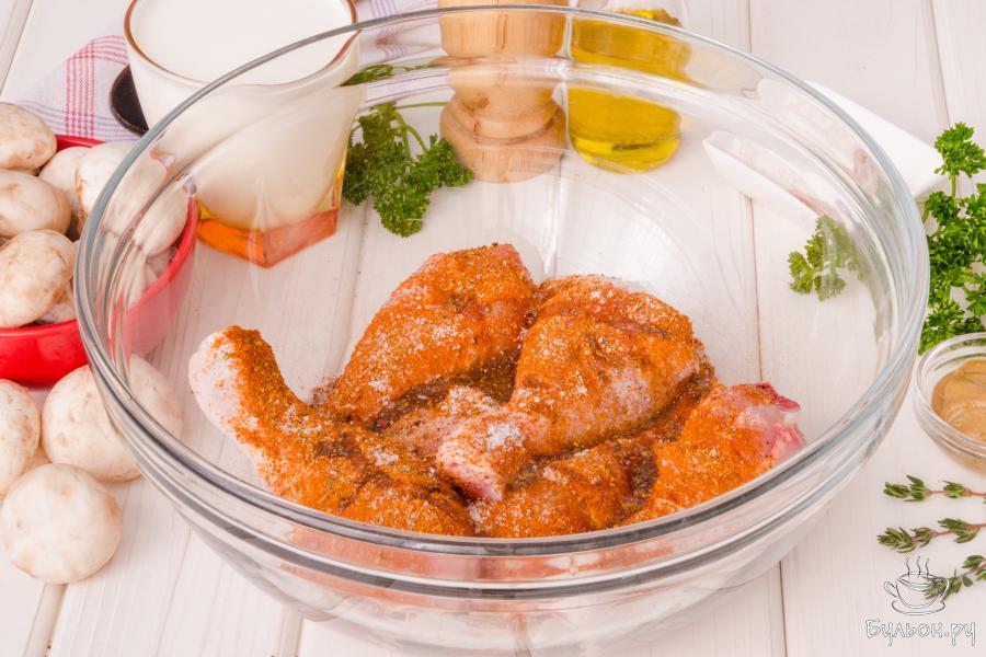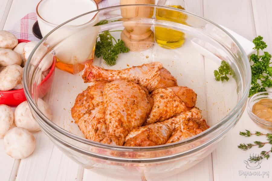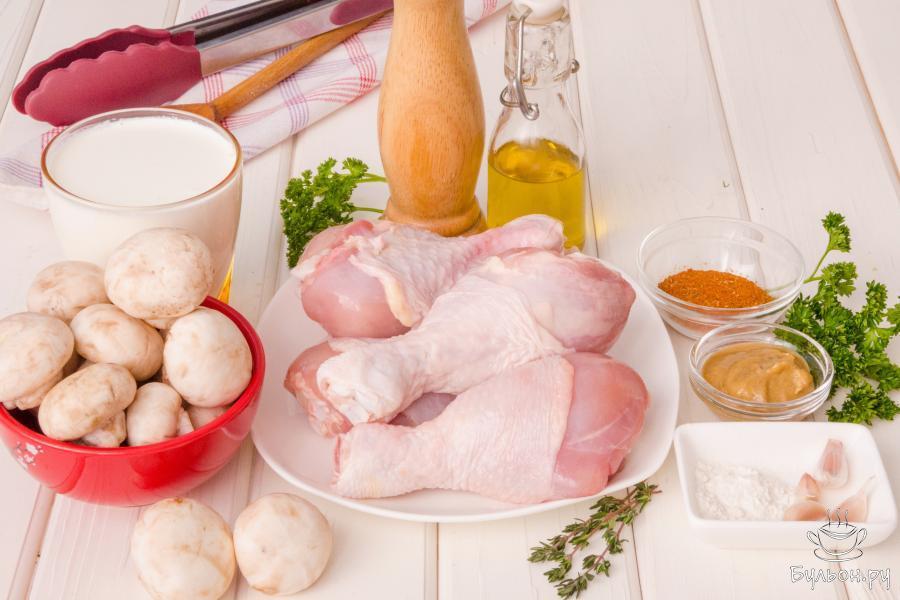 1. Для приготовления нам потребуется: куриные ножки, смесь специй для курицы (по желанию), шампиньоны, горчица, чеснок, мука, сливки (чем большей жирности, тем лучше), растительное масло, свежий тимьян (или любые травы на ваш вкус), а также соль и перец.