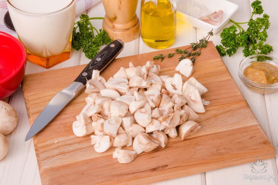 5. А тем временем подготавливаем шампиньоны. Сперва моем их под проточной водой (только делаем это достаточно быстро, чтобы грибы не впитали лишнюю воду) или же просто протираем каждый гриб влажной губкой. Далее чистые грибы нарезаем небольшими ломтиками.