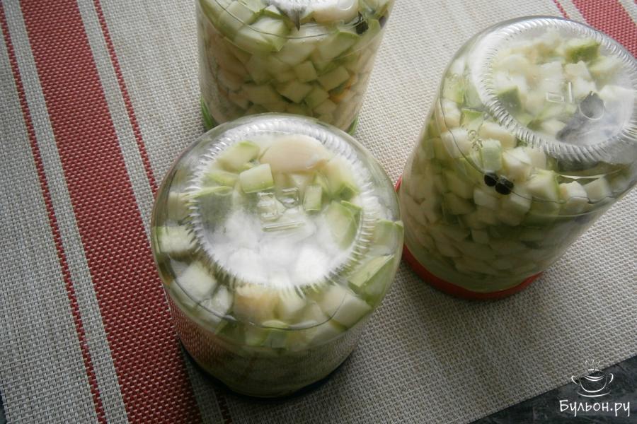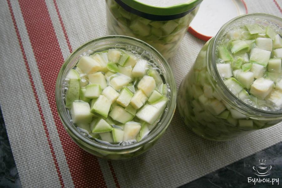 3. Залить банки с кубиками кабачков кипятком, плотно накрыть крышками и оставить для пропаривания на 15 мин. Воду из банок слить и залить кабачки второй раз кипящей водой, дать пропариться 10 мин.