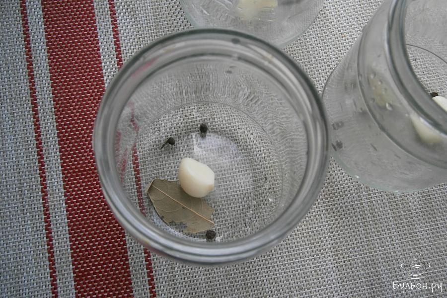 1. В чистые, хорошо вымытые и простерилизованные баночки поместить по зубчику чеснока, по 3 шт перца черного горошком и по 1 лавровому листику.