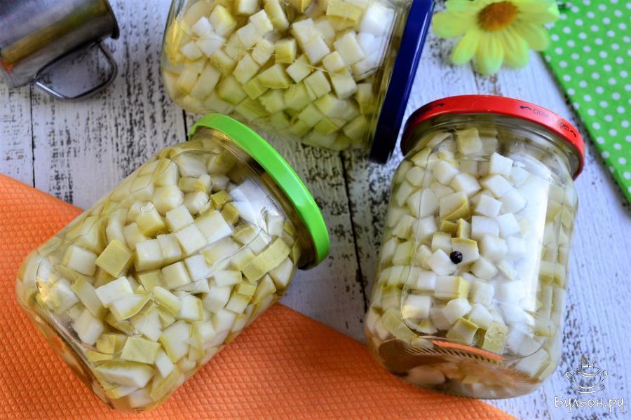 Предлагаю заготовить на зиму отличную и практичную заготовку - кабачки кубиками в маринаде. Такие кабачки в зимнее время подойдут для приготовления салатов вместо огурцов, что очень удобно - открыл баночку, слил маринад, а кубики добавил в салатик, не нужно тратить время на нарезку. Я делаю такую заготовку уже не один год, кабачки получаются вкусными и хрустящими. Главное здесь: выбирать молоденькие, крепкие кабачки и нарезать их именно небольшими кубиками, такими, как вы обычно режете в салаты. Заготовка не требует стерилизации и отлично хранится в темном прохладном месте. Из предложенного количества продуктов выход - 3 пол-литровые баночки кабачков.