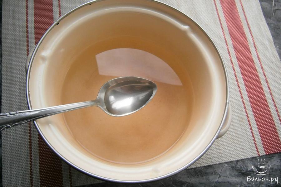 4. Пока кабачки пропариваются, приготовить простой маринад. Для этого: воду налить в кастрюлю (1 л), добавить сахарный песок и крупную каменную соль, довести все до кипения, кипятить несколько минут - до растворения соли и сахара. Затем, влить обычный 9-процентный столовый уксус.