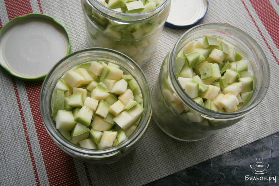 2. Кабачки, обязательно молоденькие и крепенькие нарезать небольшими кубиками (как для салата), наполнить ими баночки.
