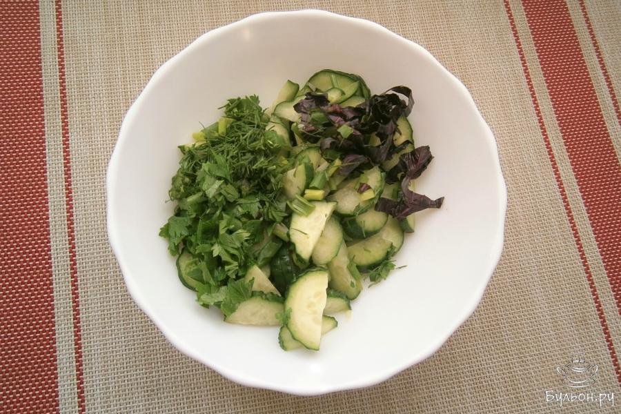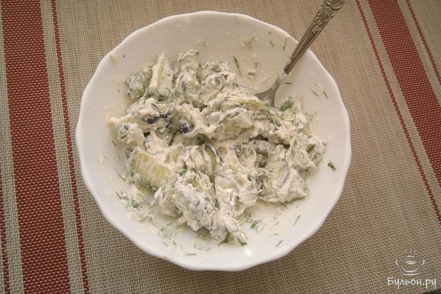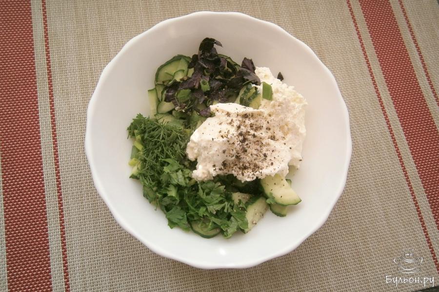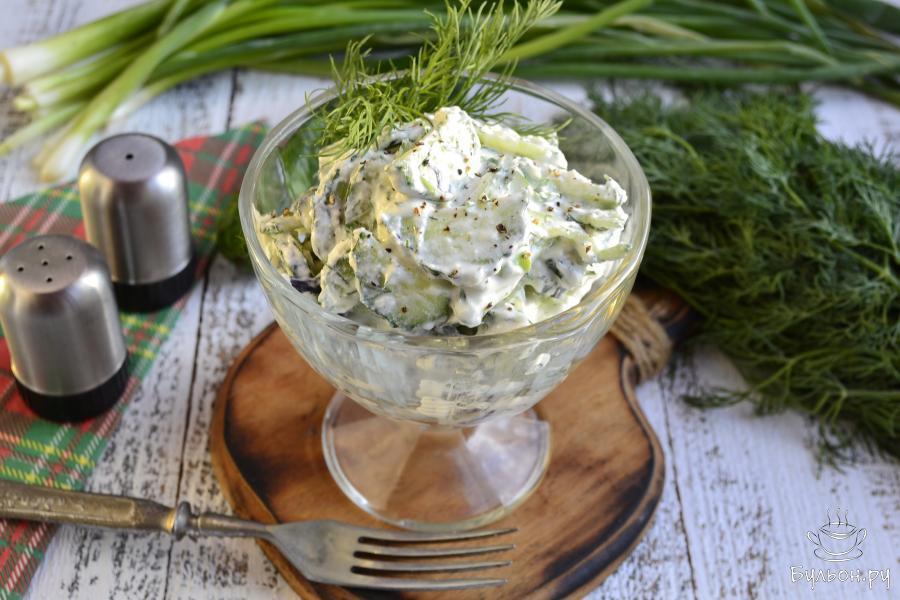 В жаркие летние дни обычно не хочется готовить и кушать очень сытные блюда, поэтому, особенно женщины, предпочитают легкие салатики. Один из таких салатов я и предлагаю вашему вниманию. Этот салат готовится из свежих огурцов и зелени, а заправляется он не маслом, не майонезом, а мягким творогом с добавлением сметаны, отчего становится не только питательным и вкусным, а и очень полезным. Рекомендую попробовать этот салат, он легкий, но им вполне можно насытить свой организм, например, на завтрак или ужин. Творог, конечно, нужно выбирать не слишком кислый и мягкий, можно и жирный, и обезжиренный. Зелень можете взять любую, какая вам нравится.