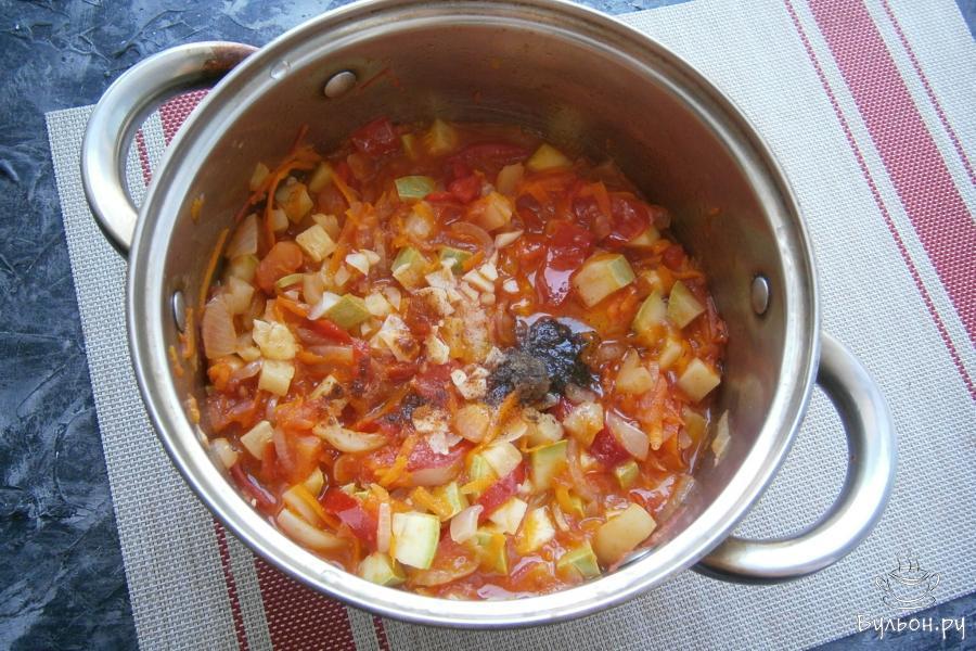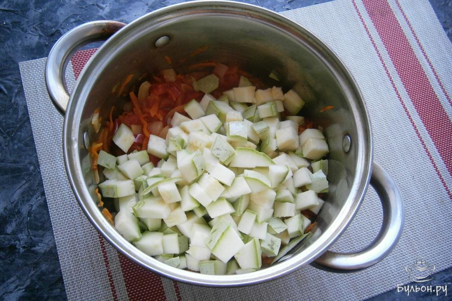 5. Далее, добавить порезанные средними кубиками кабачки. Тушить все вместе под прикрытой крышкой 15 минут.