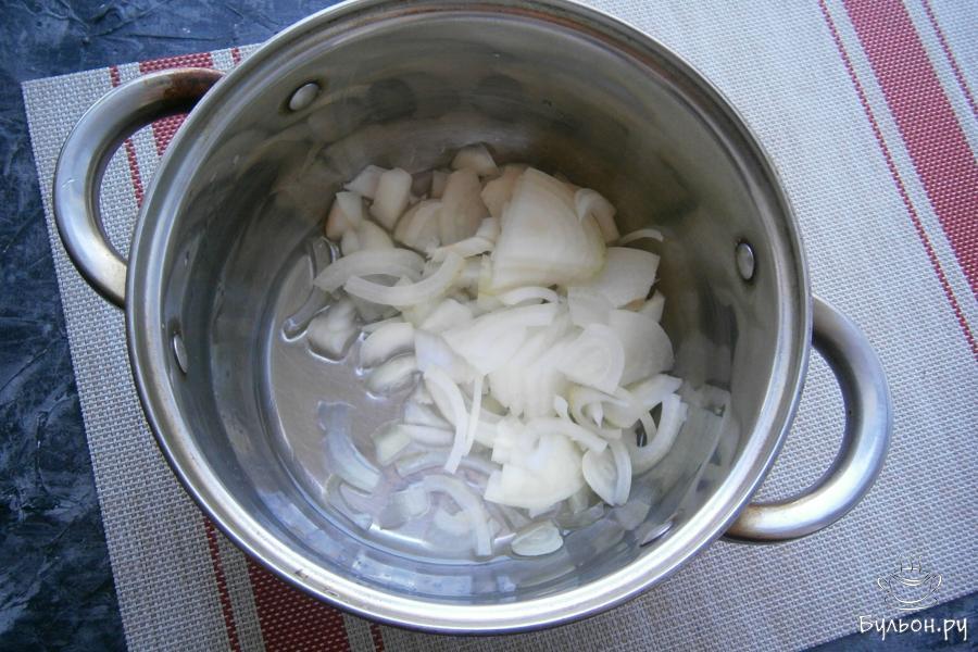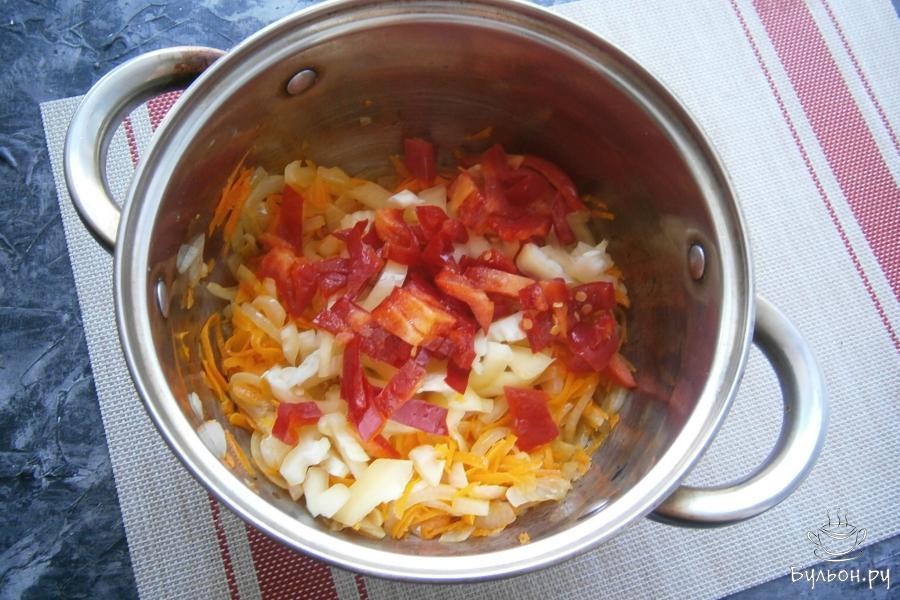 3. Все перемешать и обжарить минут 5, затем, добавить в кастрюлю порезанный соломкой или произвольно болгарский перец.