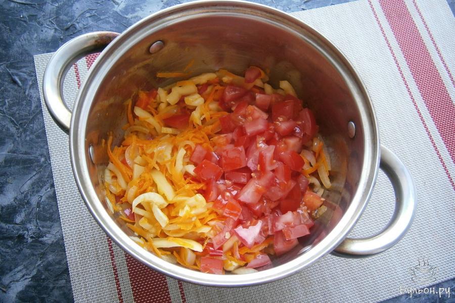 4. Все также, обжарить еще минут 5-7 и добавить порезанные кубиками свежие помидоры. Снова все перемешать и протушить около 10 минут.