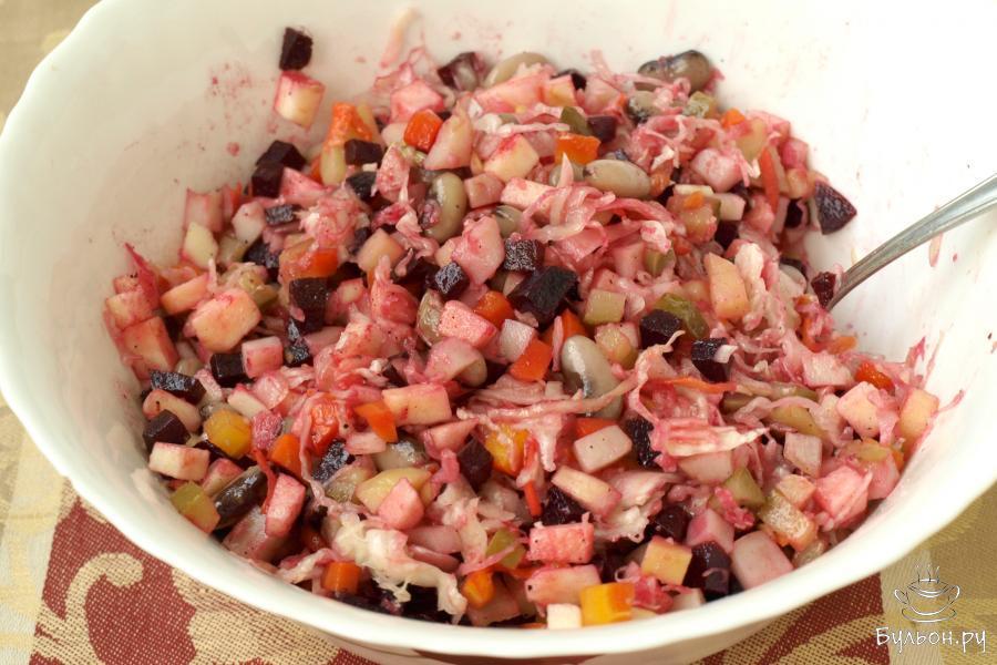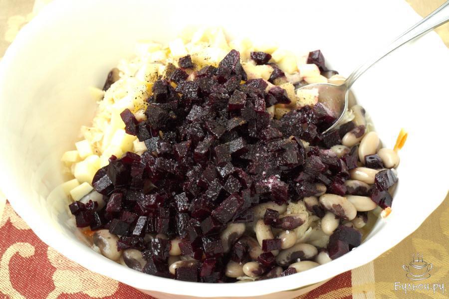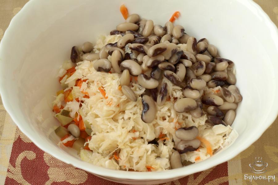 4. Добавить в винегрет квашеную капусту и консервированную фасоль. По желанию фасоль можно предварительно сварить.