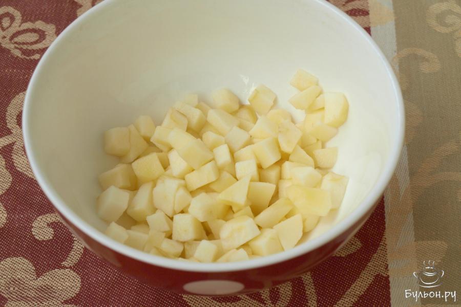 5. Очистить от кожуры яблоко, разрезать пополам, удалить сердцевины. Нарезать яблоко кубиками, как все овощи, сложить в мисочку и добавить лимонный сок, хорошо перемешать.