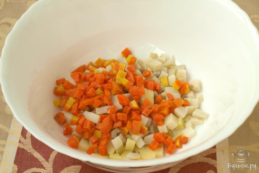 1. Для приготовления винегрета предварительно сварить до готовности свеклу, морковь и картофель. Вареную свеклу почистить, нарезать небольшими кубиками, сложить в отдельную посуду и добавить растительное масло. Это нужно сделать для того, чтобы свекла раньше времени не окрасила все остальные овощи.