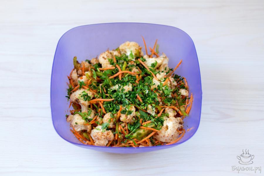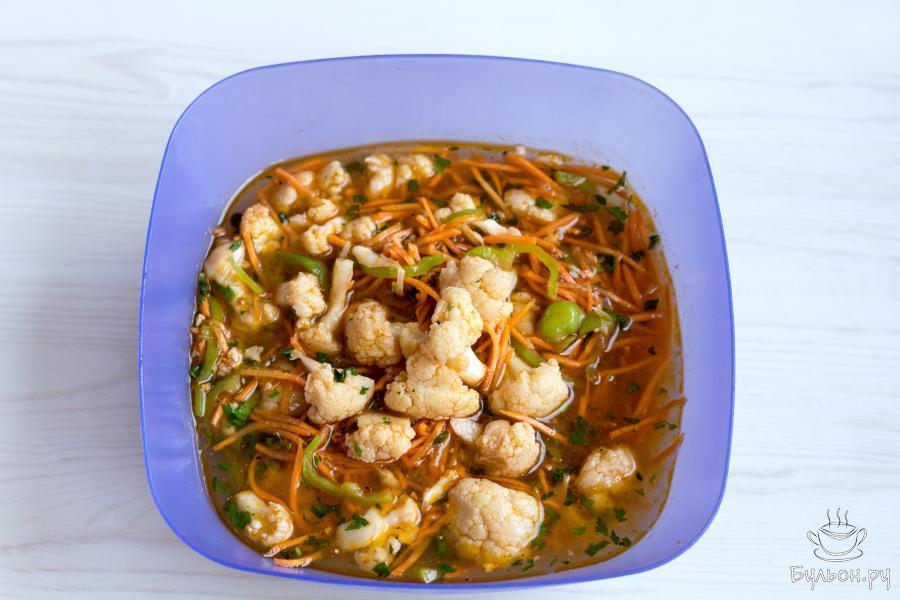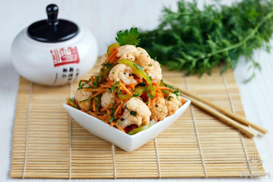 Цветная капуста, маринованная по-корейски - простая, быстрая в приготовлении и очень вкусная закуска, которую легко приготовить в домашних условиях. Дополненная овощами, свежей зеленью и пряными специями, цветная капуста получается сочной, слегка хрустящей и пикантной на вкус. Такое быстрое в приготовлении, легкое, освежающее и аппетитное блюдо, украсит повседневное меню и приятно разнообразит праздничный стол.