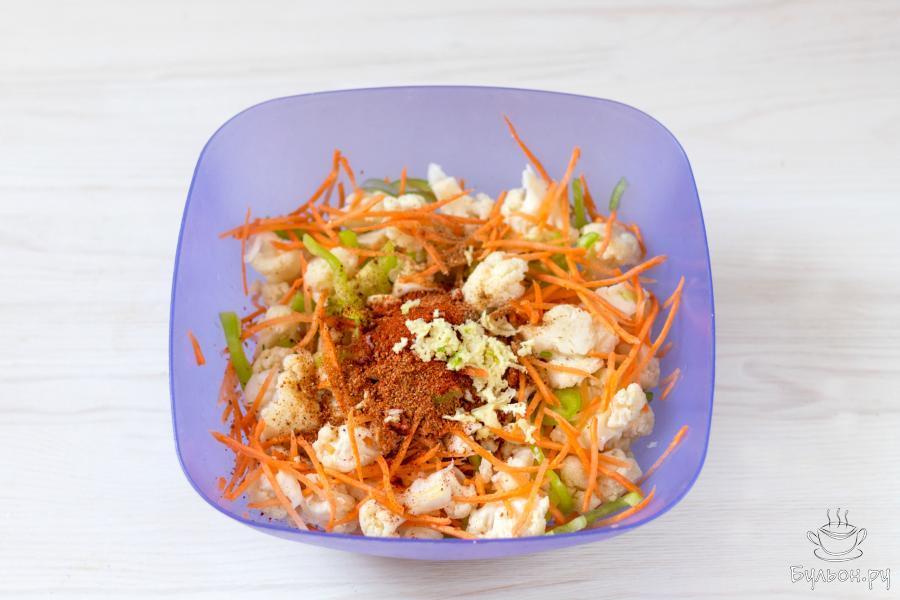 7. Добавьте специи: нарезанный чеснок, молотый красный перец, молотый кориандр (или готовую смесь приправ "для морковки по-корейски").