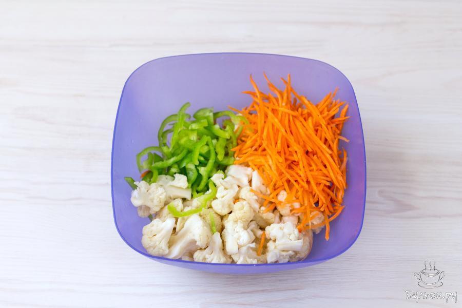 5. Натрите на специальной терке или нарежьте тонкими брусочками морковь. Мелко нарежьте зелень (петрушку или кориандр) и болгарский перец.